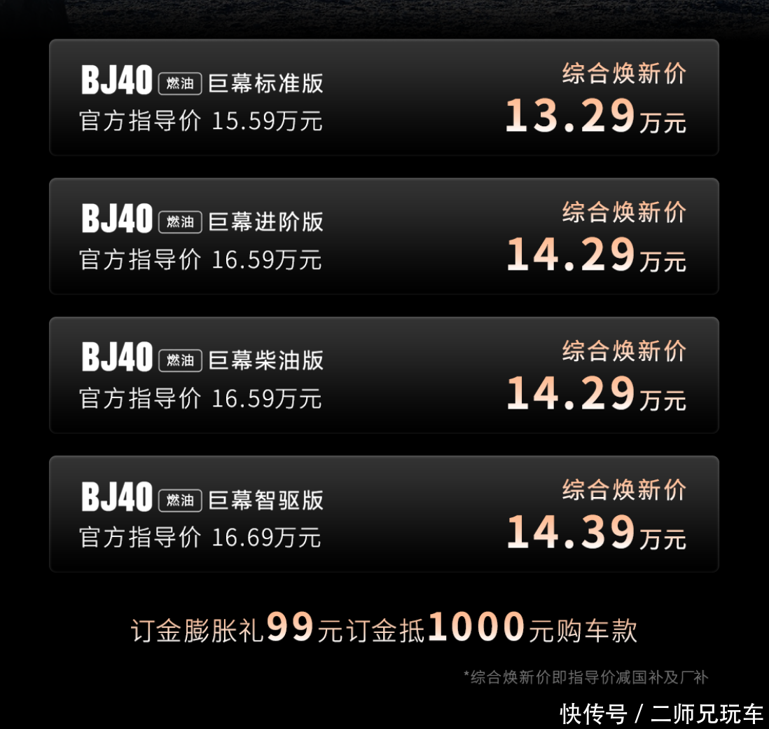 北京越野BJ40燃油巨幕版官方指导价15.59—16.69万元,综合焕新价低至13.29万元。北京越野送上订金膨胀礼:1月27日下订,即可享受“99元订金抵1000元购车款”优惠政策。