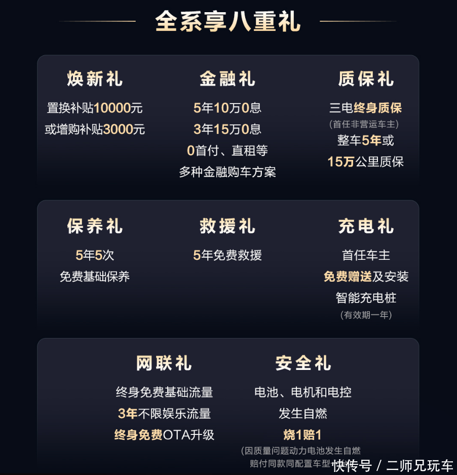 第八重,安全礼:电池、电机和电控发生自燃,烧1赔1(因质量问题动力电池发生自燃赔付同款同配置车型一台)。