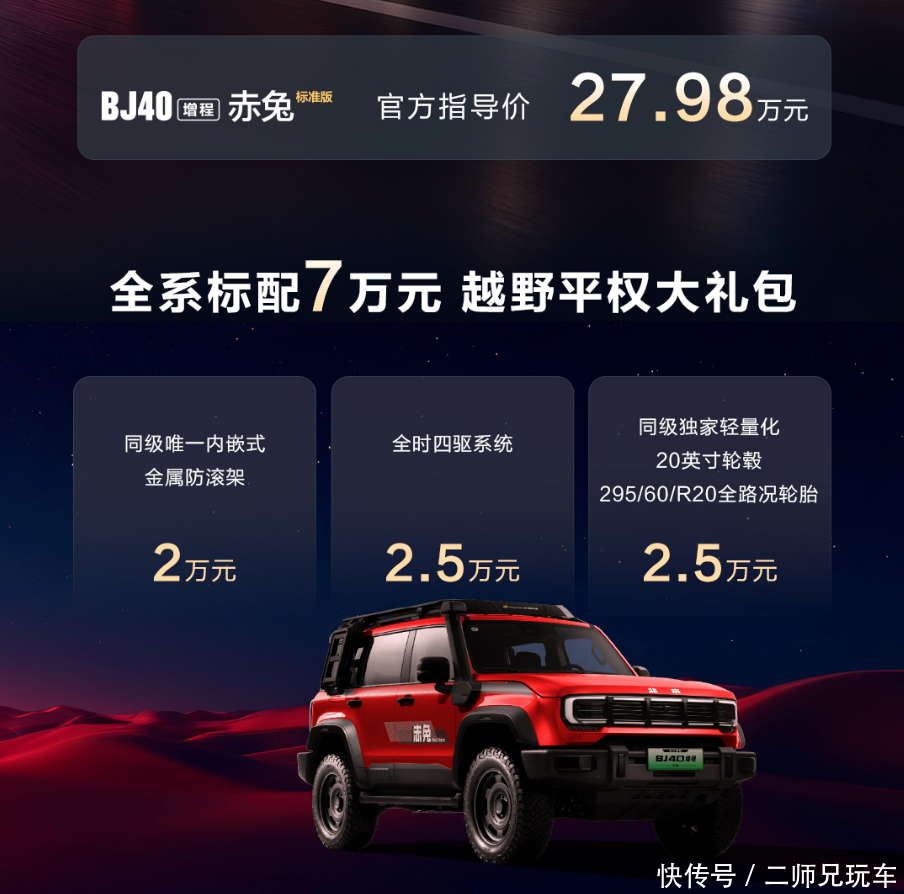 BJ40增程赤兔标准版官方指导价27.98万元!购车即可享有价值7万元的“越野平权大礼包”,包含价值2万元的同级唯一内嵌式金属防滚架、价值2.5万元的全时四驱系统和价值2.5万元的同级唯一轻量化20英寸轮毂与295/60 R20全路况轮胎。