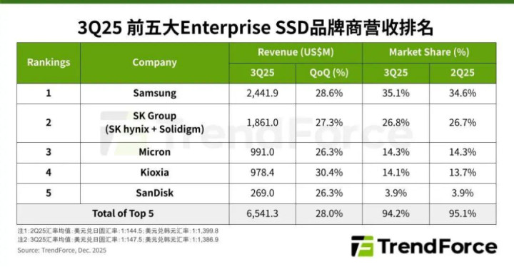Q3企业级SSD市场迎来显著成长,该季度前五大品牌厂合计营收季增28%,达65.4亿美元,创今年新高。