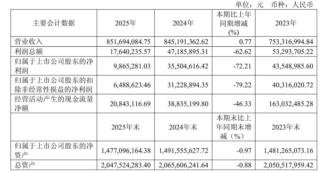 4月13日晚间,海正生材(688203)发布2025年年度报告,公司营业收入为8.52亿元恒指配资开户,同比上升0.77%;归母净利润为986.53万元,同比下降72.21%,已连续第三年下跌且跌幅扩大;扣非净利润为648.86万元,同比下降79.22%。