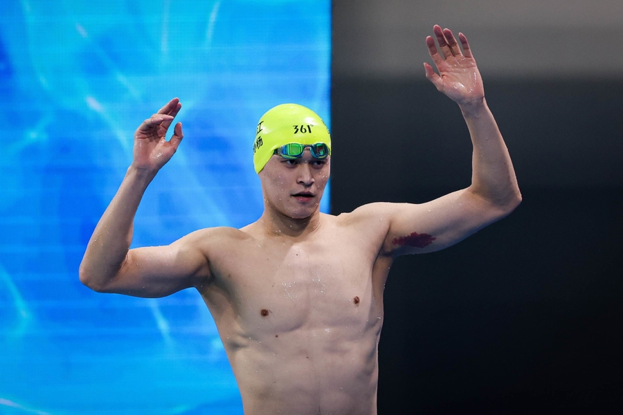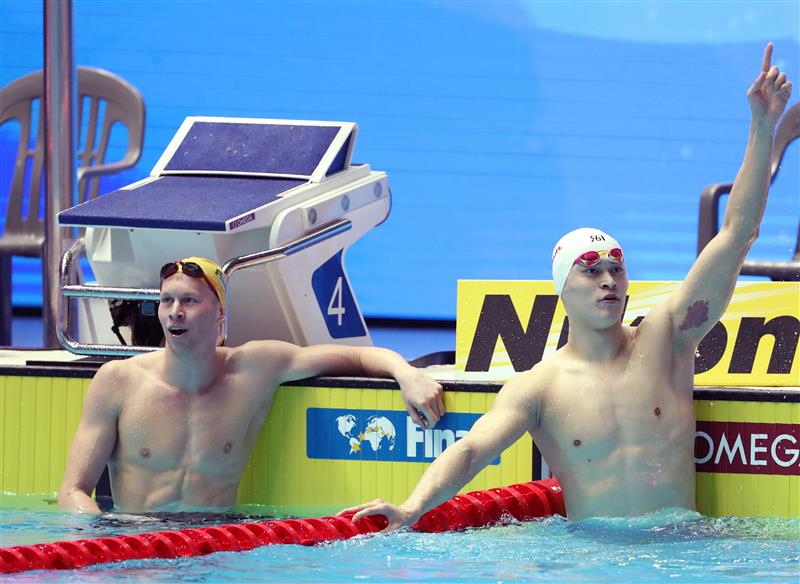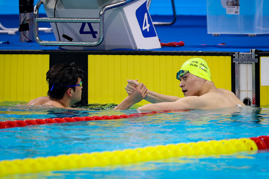 预赛结束后,孙杨与邻道的潘展乐握手致意(王竟成摄)